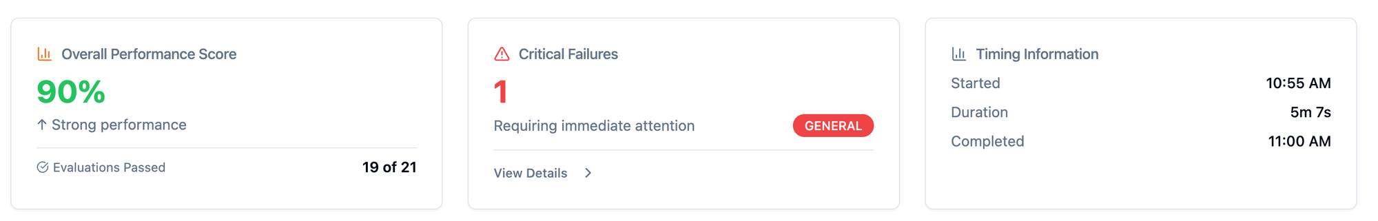 In this case, the agent achieved a 90% performance score, passing 19 out of 21 evaluations, with one critical failure flagged for review. These insights help teams decide whether a new version is ready for release or needs further refinement.